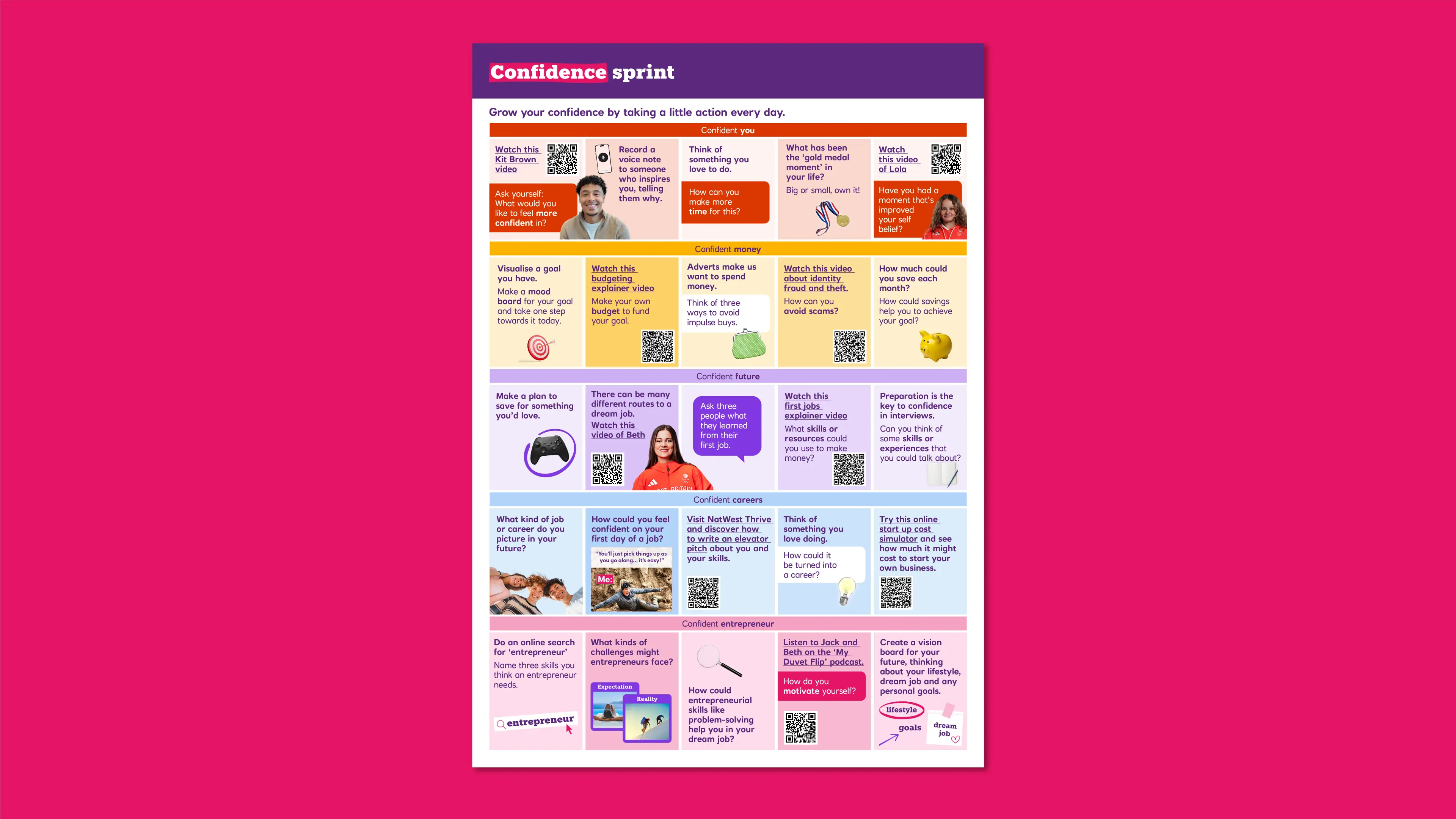 The NatWest Thrive Confidence Sprint aims to help young people aged 11–18 build confidence in money, careers, and their future, by taking a little action each day. Download the accompanying delivery guide here.