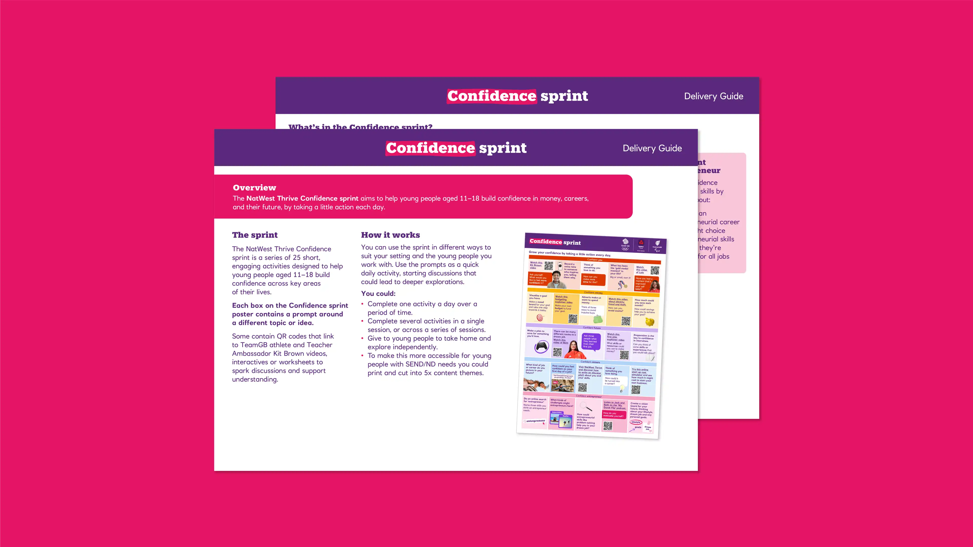 The NatWest Thrive Confidence Sprint aims to help young people aged 11–18 build confidence in money, careers, and their future, by taking a little action each day. Please see the delivery guide below, the Confidence sprint is linked here